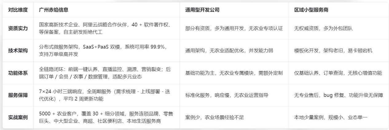 从资质、技术、功能、服务、案例五大核心维度对比,广州赤焰信息与其他服务商差异显著: