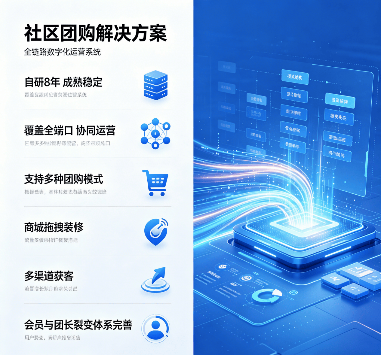 系统覆盖消费者端、团长端、供应商端等七大核心端口,实现“采购-运营-履约-售后”全流程闭环,智能分拣、智能调度等功能可大幅提升运营效率,降低人力成本。
