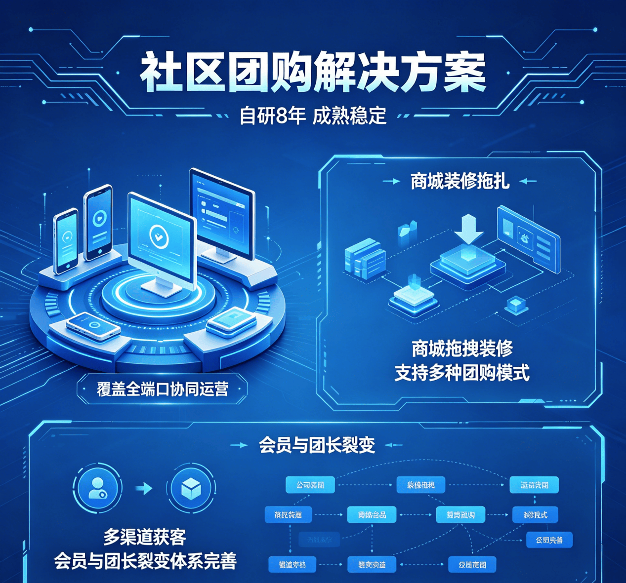 产品拥有七大全链路端口,构建闭环数字化运营体系,包含消费者端、团长端、供应商端、平台端、司机端、分拣端、商家端,覆盖下单、开团、供货、管理、配送、分拣、后台运维全流程。同时支持六大主流成熟业务模式,涵盖次日达团购、前置仓即时配送、团批、团店、多人拼团、门店入驻,商家可自由组合模式,适配生鲜零售、农产品销售、本地生活服务等多元经营场景。